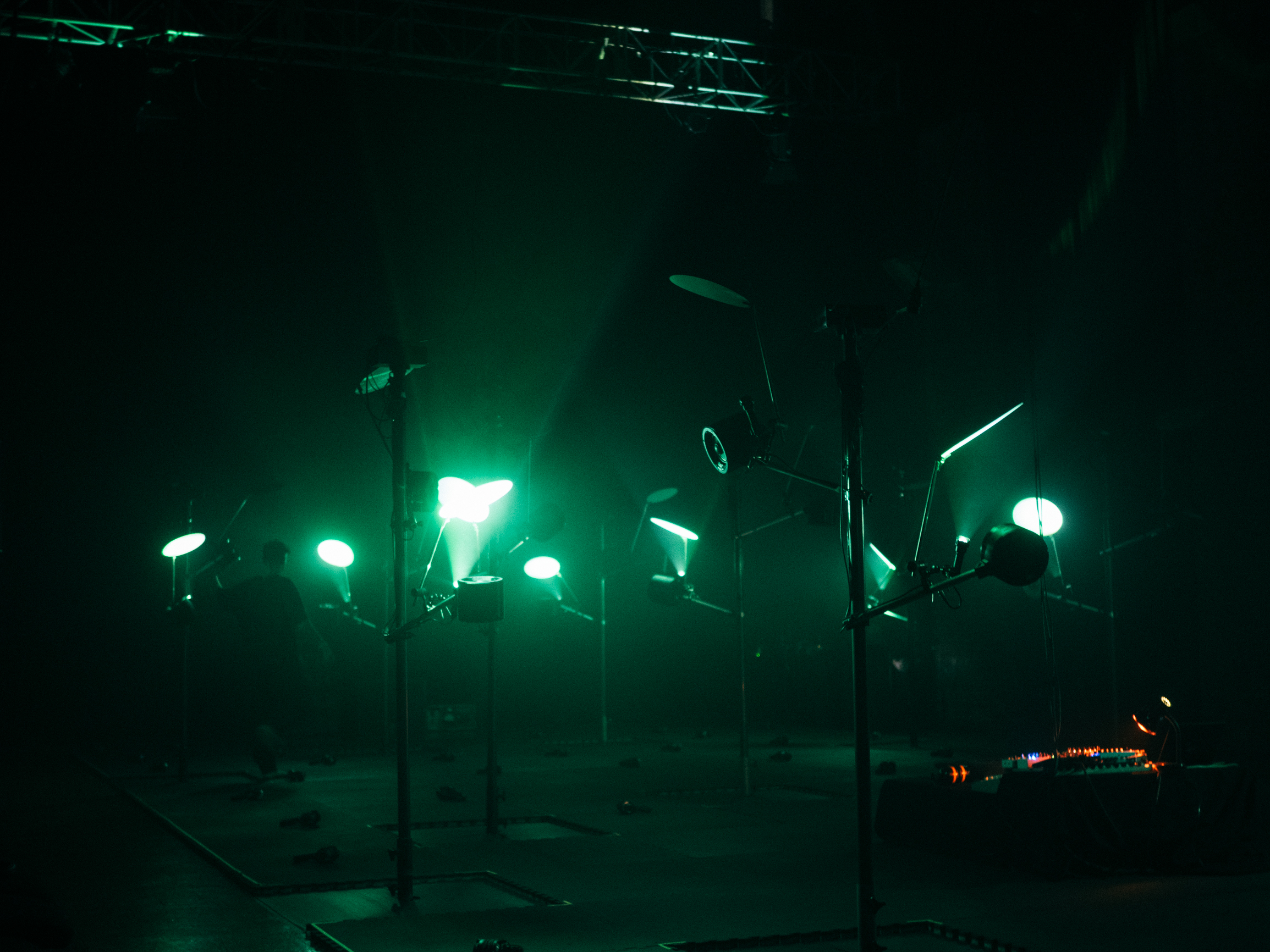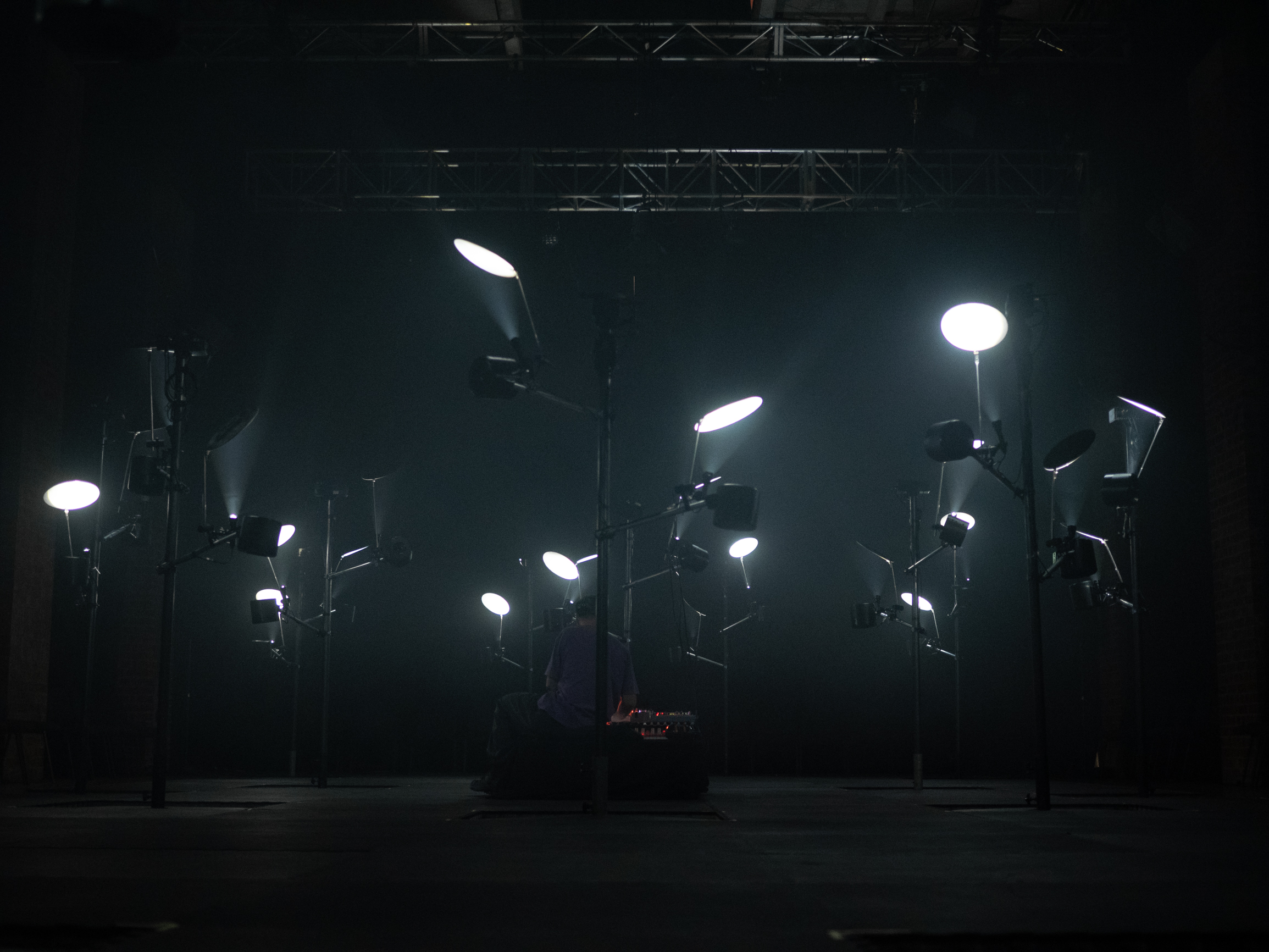 16 light fixtures made with repurposed flashlights and hand-worked reflectors are controlled from Ableton using a custom made Max patch and 8 Dual Flow mini-spot control units.
